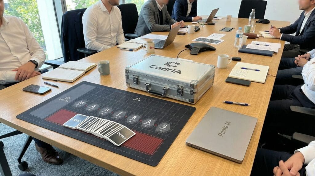 Le Cockpit CadrIA est un dispositif physique (méthode, cartes, tapis de pilotage) qui remplace la formation par une architecture collective. Sans cadre commun, l’usage de l’IA reste individuel, non traçable et invisible pour la direction. Le Cockpit rend les décisions visibles, auditables et conformes dès la première session.